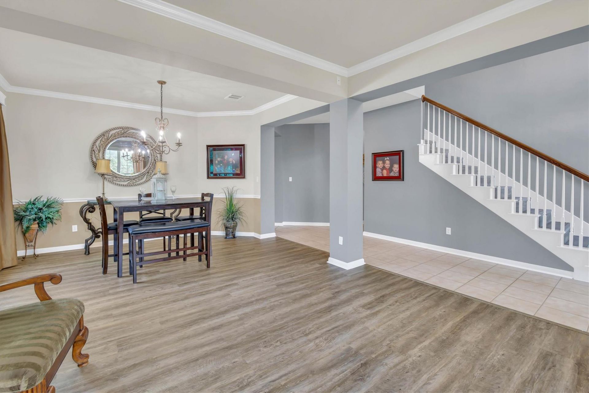 Fresh paint and hard-surface flooring throughout?no carpet, just tile and luxury vinyl plank?give this home a clean, modern feel. The spacious primary suite features two walk-in closets, offers plenty of storage.Upstairs, a versatile third living area separates the two additional bedrooms?perfect as a game room, media space, or a private teen retreat. The flexible floor plan adapts easily to a variety of lifestyles.The bright, open kitchen boasts white cabinetry and light Corian countertops, with ample space for multiple cooks. It overlooks the covered back patio and provides easy access to an extended outdoor entertaining area?ideal for gatherings.A full bedroom and bathroom downstairs offer excellent options for guests, multigenerational living, or a dedicated home office.Step outside to a peaceful backyard retreat featuring Bradford pear and peach trees, along with three Martin houses that attract birds and enhance the natural setting. Additional highlights include a full sprinkler system, fresh sod, and new mulch.Storage is abundant, with a storage area in the 2-car garage and a unique, floored attic space affectionately known as Santas Closet.Conveniently located, the elementary and high schools are just about a mile away, and the middle school is approximately two miles away. Enjoy easy access to two HOA community centers featuring pools, basketball courts, trails, playgrounds, and more. Plus, you're just a short drive from shopping, dining, parks, and entertainment.