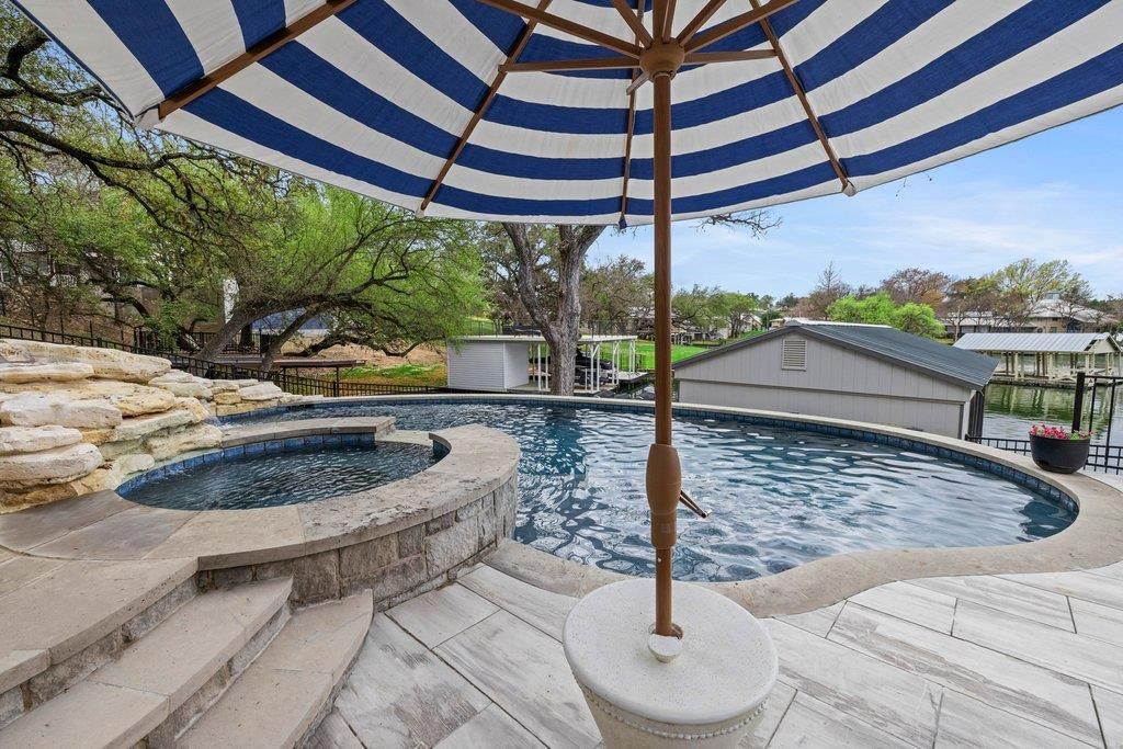 Turnkey,Furnished Lake LBJ Waterfront with Sunset Views & Private Boathouse Experience Lake LBJ waterfront living at 205 Beaver Circle in Blue Lake Estates. Perfectly positioned for spectacular Hill Country sunsets, this property offers the ideal lake lifestyle with boating, water sports, and outdoor entertaining. The backyard retreat features a pool and spa with waterfall and waterslide, multiple patios, and a lakeside fire pit for sunset evenings. The private boathouse includes a boat slip with lift, two jet ski lifts, and storage with refrigerator, freezer, and ice maker. Inside, enjoy an open kitchen, living, and dining area with vaulted ceilings and lake views, plus 4 bedrooms and 3 full baths. A circular driveway and wrought iron fenced yard complete the property. Residents enjoy Blue Lake Estates amenities including lake access, boat ramp, pool, tennis courts, and park areas, minutes from Horseshoe Bay Resort golf and Marble Falls dining.